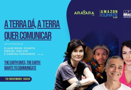 No dia 10 de novembro, às 16h, durante o primeiro dia da COP30 em Belém (PA), o ARAYARA Amazon Climate Hub sediará a mesa “A Terra dá, a Terra quer comunicar”, promovida pelo Instituto Internacional ARAYARA em parceria com o portal SUMAÚMA – Jornalismo do Centro do Mundo. O encontro reunirá a jornalista Eliane Brum, o neurocientista e escritor Sidarta Ribeiro, o jornalista indígena Éhn Xym (povo Akroá Gamella) e mediação de Luz Dorneles, para refletir sobre como a Terra se comunica e a urgência de reconectar-se à natureza em tempos de emergência climática. A atividade, que homenageia o filósofo e ativista quilombola Nego Bispo, integra a programação do Hub — espaço estratégico da ARAYARA voltado à convergência entre inovação tecnológica e conhecimento ancestral na busca por soluções para a crise climática.