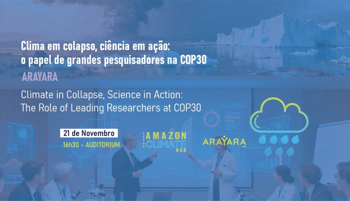 Painel Cientistas do Clima – Amazon Hub Arayara | COP30, em Belém/PA, será um encontro voltado a conectar ciência e ação climática. A programação inicia às 14h com um painel de abertura conduzido por Paulo Artaxo, abordando evidências e impactos das mudanças climáticas no Brasil, mediado por representante da Arayara. Às 15h30, a mesa técnica contará com Jefferson Choma, debatendo projeções, riscos e estratégias de adaptação, Hirdan Costa, falando sobre direitos humanos e mudanças climáticas e Núbia Caroline Giese, finalizando com a perspectiva do saber dos povos tradicionais para o enfrentamento da crise global. A mediação será de Nicole (Arayara) e um jornalista científico. Às 17h, acontece a sessão especial de lançamento do relatório técnico do Monitor Energia, apresentada pelos diretores da Arayara, com coletiva de imprensa. O evento segue às 18h com um coffee break amazônico e, às 19h, com a exibição do documentário Cientistas do Clima: Guardiões do Futuro, seguido de talk show com jovens e líderes comunitários sobre o papel da ciência no legado climático. O encerramento, às 20h, terá show amazônico celebrando ciência, cultura e compromisso com limitar o aquecimento global a 1,5°C.
