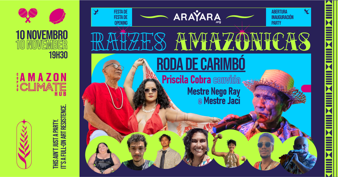 Venha celebrar conosco a inauguração do Amazon Climate Hub em uma noite inesquecível que vibra com as Raízes Amazônicas! Esta festa especial é uma homenagem à ancestralidade, cultura, resistência e música do Pará, representada de forma autêntica por uma roda de Carimbó comandada por Priscila Cobra e os mestres Nego Ray e Jaci.