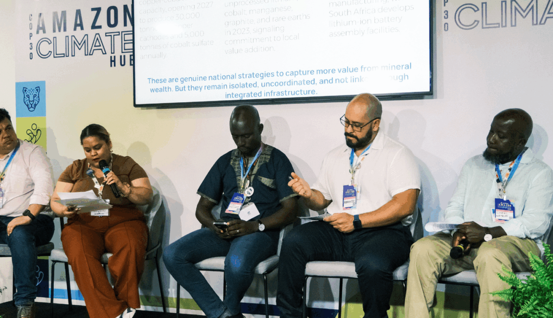 Leezola Zongwe, especialista em direito extrativista, com foco em minerais críticos pan-africanos e políticas de segurança energética da Enzi Ijayo Africa Initiative, destacou dados do estudo que mostram que a África detém 30% das reservas mundiais de minerais críticos, produz 70% do cobalto global e controla 36% do manganês e 80% dos metais do grupo da platina, recursos dos quais o mundo depende para avançar na transição dos combustíveis fósseis. Ela alertou que, apesar dessa abundância, o continente retém apenas entre 5% e 10% do valor gerado por esses minerais. Zongwe também ressaltou a importância de fortalecer diálogos como este, conectando experiências da África com países amazônicos, que enfrentam desafios semelhantes em termos de dimensão e complexidade territorial.